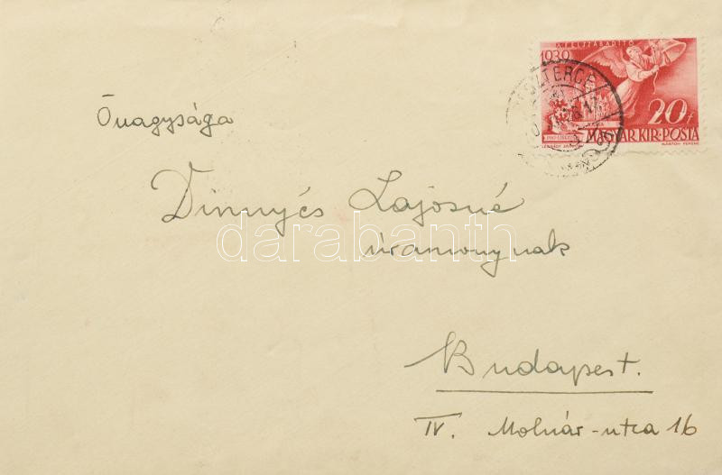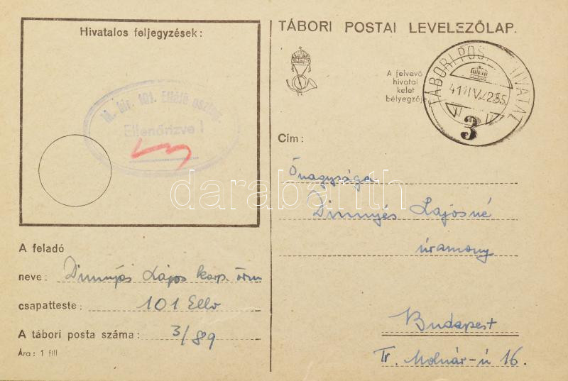 VÉDETT!!! cca 1941-1943 Dinnyés Lajos (1901-1961) karpaszományos őrmester, későbbi miniszterelnök, kisgazda politikus II. világháborús levelezése a frontról, feleségével, Dinnyés Lajosné Hegedűs Katalinnal (1909-1997), de közte 1935-1940 közötti levelekkel, lapokkal is. Benne kb. 137 db tábori postai levelezőlap, 5 zárt levelezőlap és 6 db levelezőlap, 9 levél és 23 borítékos levél, 6 távirat. + 1944-es Légoltalmi Ligás dokumentum is. Változó, nagyrészt kézzel írt levelek és levelezőlapok, de közte gépelt is. Változó, nagyrészt jó állapotban.