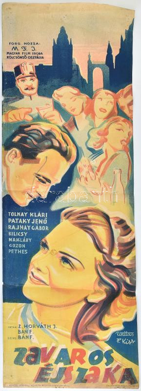 Zavaros éjszaka (1940). Moziplakát (filmplakát, rácsplakát) Tolnay Klári, Pataky Jenő, Rajnay Gábor, Bilicsy (Bilicsi) Tivadar, Gózon Gyula és mások szereplésével. Rendezte: Bán Frigyes. Litográfia, papír. P. Kiss Pál grafikája, jelzett a litográfián jobbra lent. Unitas Nyomda. MFI Film. Hajtásnyomokkal, sérült, helyenként kissé foltos. 95×30,5 cm. / Vintage rare Hungarian poster of movie from 1940, lithograph on paper, damaged.