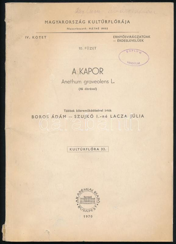 Boros Ádám - Lacza Júlia et al.: A kapor. Anethum graveolens L. Magyar... https://www.darabanth.com/en/434-Online-auction/434.0/Books/Books-Gastronomy-and-Gardening~1000011/Boros-Adam-Lacza-Julia-et-al-A-kapor-Anethum-graveolens-L-Magyarorszag-Kulturfloraja-IV~II2760887