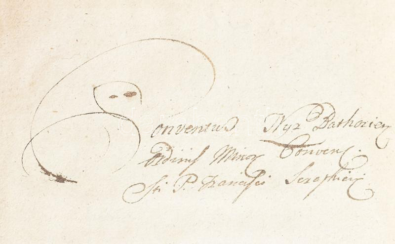 Bartholomaeus Comandus: Vita F. Lavrentij Brancati Ex Ordine Minorum Conuentualium Tit. SS. Duodecim Apostolorum S. R. E. Presbyteri Cardinalis Bibliothecarij de Lavraea. Compendiose descrpita per Fr. Bartholomaeum Comandum. Romae, 1698, Typis Haeredum Corbeletti, 103 p. Latin nyelven. Korabeli aranyozott, bordázott gerincű álbordás egészbőr-kötés, kopott borítóval, az elülső táblán sérüléssel, a gerincen kis sérüléssel, possessori bejegyzéssel, intézményi bélyegzéssel, a lapok alsó részén, a szöveget nem érintő szúette lyukakkal.