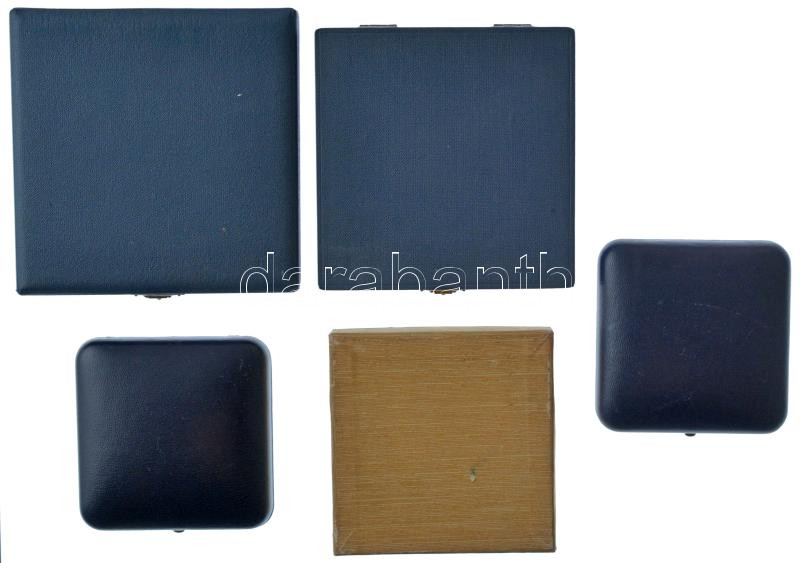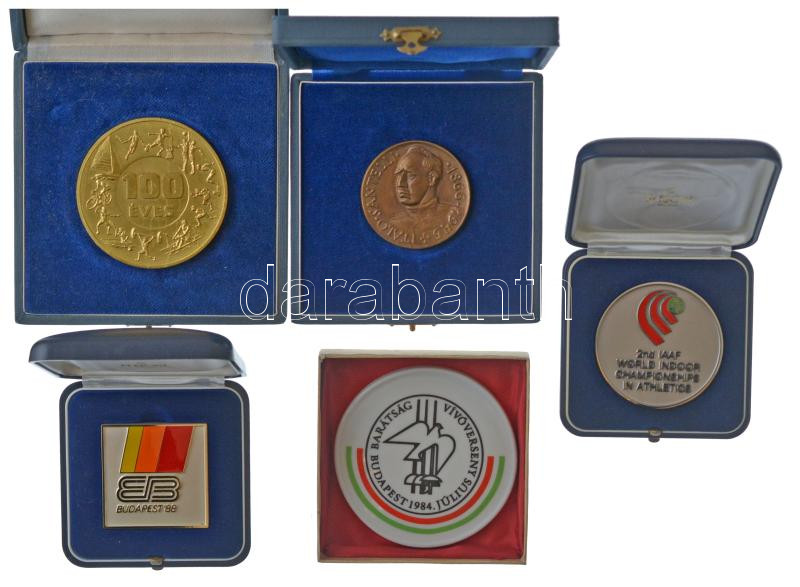 Description: 5 darabos vegyes sport emlékérem és díjérem tétel, közte 1988. "100 éves / MTK-VM Sportklub 1888-1988" kétoldalas aranyozott bronz emlékérem dobozában (70mm), 1988. "Fedettpályás Atlétikai Európa Bajnokság - Budapest 1988" részben műgyantás fém díjplakett" Bertoni-Milano" gyártói jelzéssel, mind dobozában T:1-