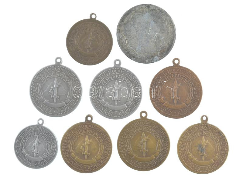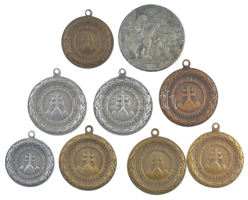 Description: ~1920-1930. "DULCE ET DECORUM EST PRO PATRIA MORI (Édes és dicső dolog a hazáért feláldozni az életet) / A Budapesti Középiskolai Athletikai Club Versenydíja" 8xlkf bronz, Al kétoldalas díjérmek (30mm-36mm) + 1964. Újpest felszabadulási Emlékverseny I." lövész díjérem (40mm) T:2,2- patina, korrózió