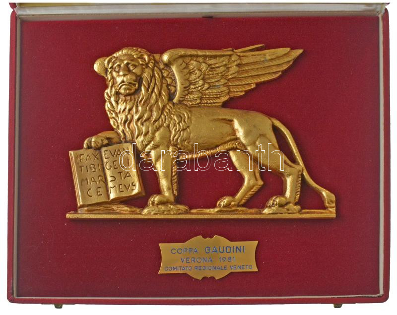 Olaszország 1981. "Coppa Gaudini Verona 1981 Comitato Regionale Veneto" vívó emlékplakett, aranyozott Velence címerrel, eredeti dísztokban, "INCISORE SANTI MESTRE" jelzésű eredeti tokban (oroszlán: 153x215mm) T:1-