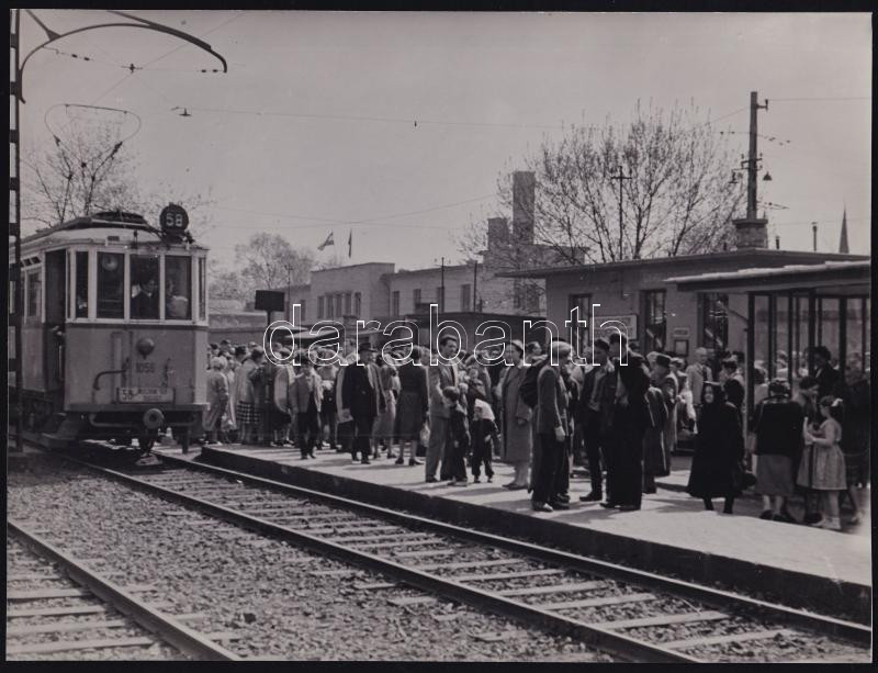 1957 Vasárnap délelőtt a szabadsághegyi fogaskerekű vasút végállomásánál, az 58-as villamossal, fotó, hátoldalon feliratozva, szép állapotban, 18×23cm