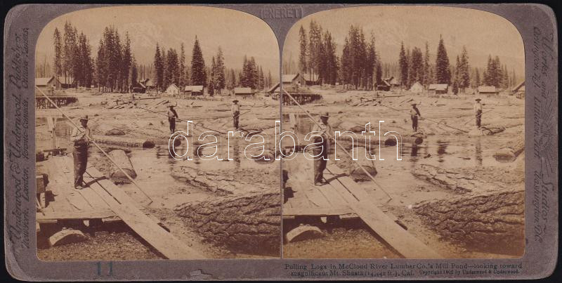 cca 1908 Amerika, fakitermelők tutajt készítenek a farönkökből, vintage sztereófotó, 8,5x17,5 cm
