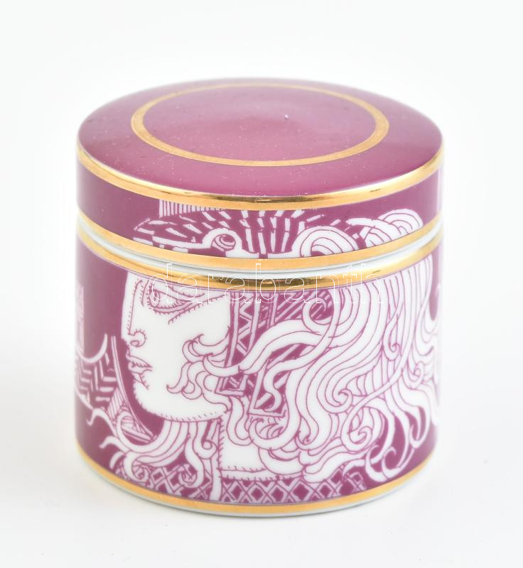 Hollóházi Szász Endre által tervezett porcelán, lila tégely. Matricás,...