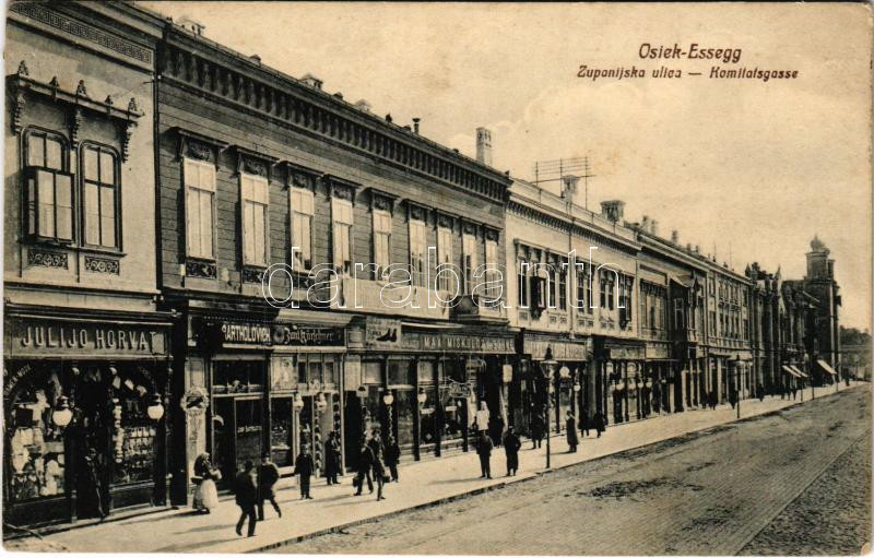 Eszék, Essegg, Osijek; Zupanijska ulica / Komitatsgasse / utca, Julijo Horvát, Bartholovich, Kürschner, Max Miskolczy fia, Julius Bauer üzlete / street, shops (ragasztónyom / gluemark)