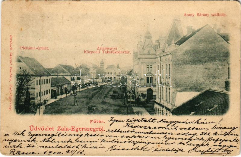 1900 Zalaegerszeg, Fő tér, Plébánia, Zalamegyei Központi Takarékpénztár, Arany Bárány szálloda. Breisach Sámuel kiadása (EB)