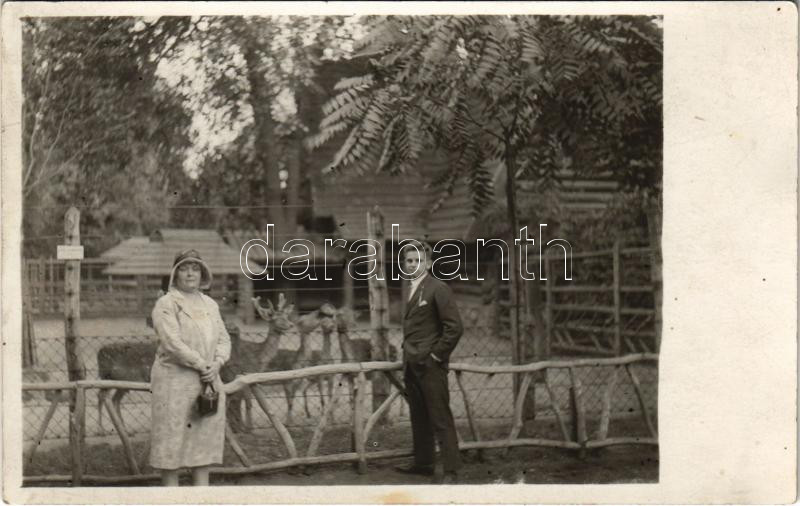 1930 Budapest XIV. Állatkert, dánszarvasok ketrece előtt, előtérben Il...