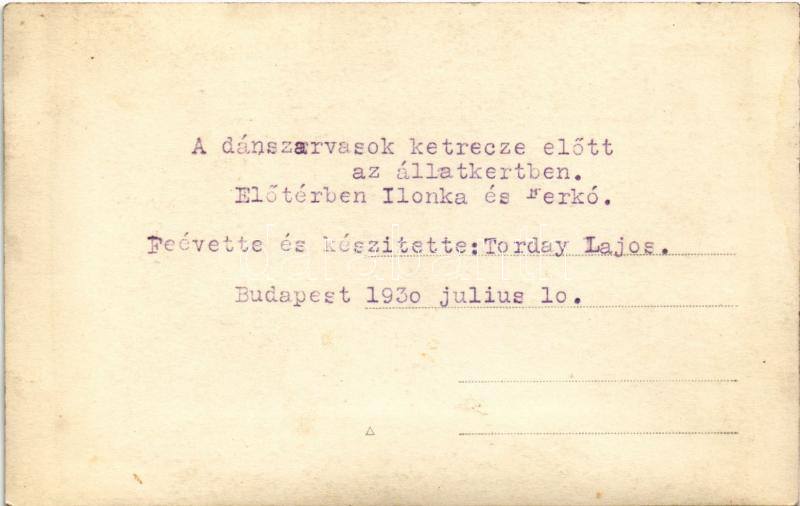 https://www.darabanth.com/en/434-Online-auction/434.0/Postcards/Hungary~2000004/1930-Budapest-XIV-Allatkert-danszarvasok-ketrece-elott-eloterben-Ilonka-es-Ferko-Torday-L~II2806533