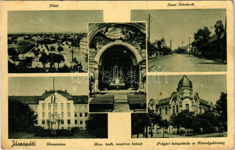 Description: 1941 Jászapáti, gimnázium, Fő tér, Szent István út, Római katolikus templom belseje, Polgári leány iskola és Főszolgabíróság. Busay Balázs kiadása (Rb)
