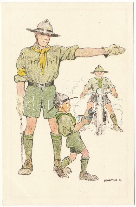 Description: A cserkész feljebbvalóinak jó lélekkel és készségesen engedelmeskedik... Kiadja a Magyar Cserkészszövetség Nagytábortanácsa 1926. / Hungarian boy scout art postcard s: Márton L.