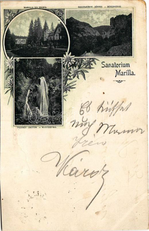 1898 (Vorläufer) Marilla, Marillavölgy, Marila; Sanatorium Marilla, Marilla en Profil / Szanatórium, Minnis-hegyszoros, Zsittin-vízesés / sanatorium, mountain pass, waterfall, spa. Art Nouveau, floral (vágott / cut)