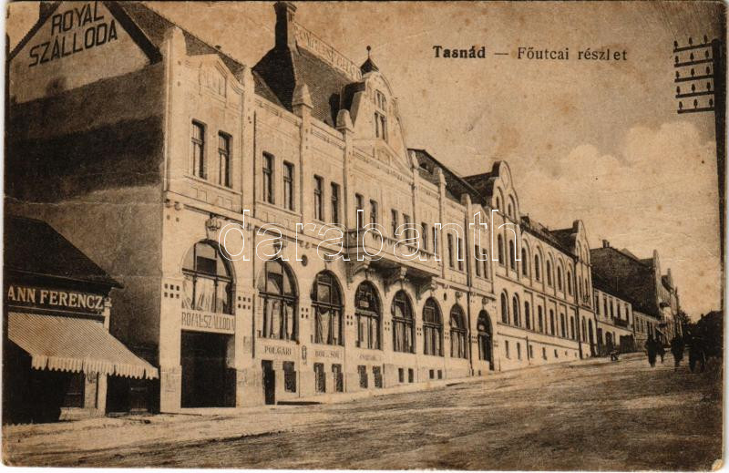 Tasnád, Fő utca, Royal szálloda, polgári bor és sörcsarnok, üzlet / ma...