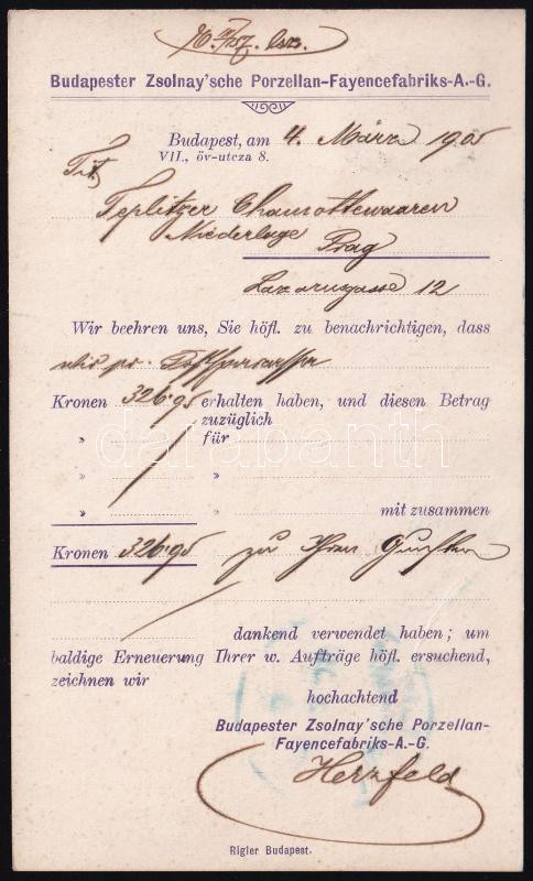 1905 Zsolnay porcelángyár előnyomott számlás levelezőlap