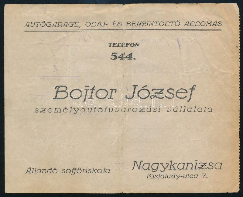 1941 Bojtor József személyautófuvarozási vállalata, autógarage, olaj- és benzintöltő állomás, Nagykanizsa, fejléces jegyzék (taxi számla), bélyegzővel