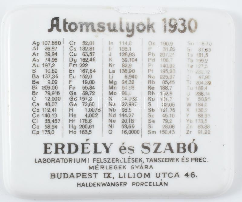 Description: 1930 Atomsúlytáblázat, Erdély és Szabó Laboratóriumi felszerelések, tanszerek, és Prec. Mérlegek gyára. Budapest IX, Liliom utca 46. Haldenwanger Porcelán. Kis sérüléssel, kopásokkal, 11x13 cm