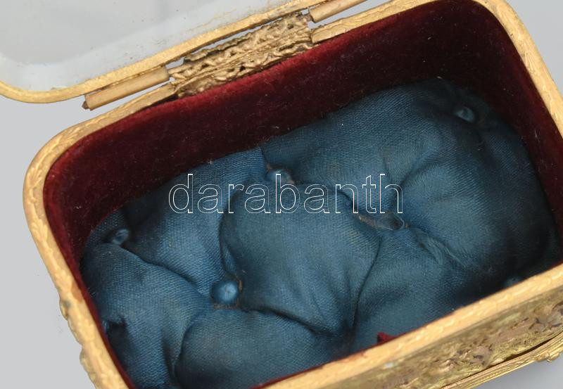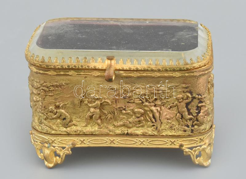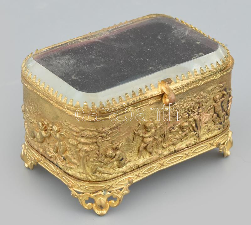 Ékszerdoboz, aranyozott fém, csiszolt üvegfedéllel, ámor és puttó figurákkal gazdagon díszített, belsejében bársonnyal bélelt, kopásnyomokkal, 7x9,5x6 cm