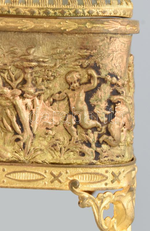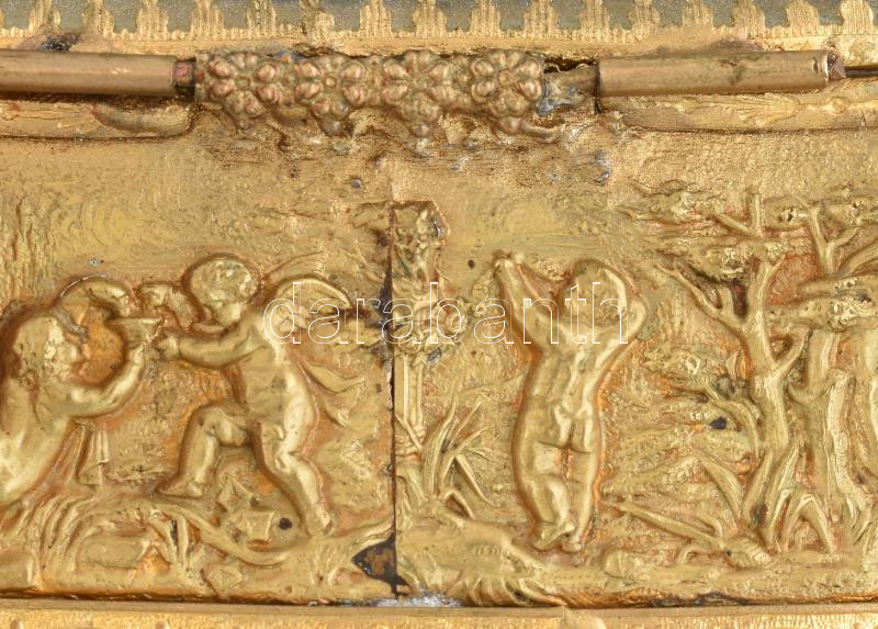Ékszerdoboz, aranyozott fém, csiszolt üvegfedéllel, ámor és puttó figu...