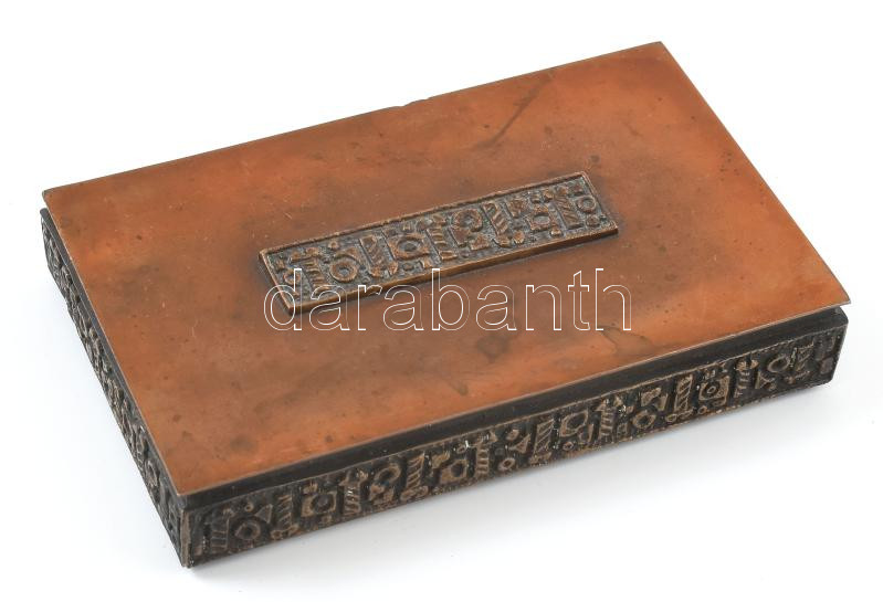 Iparművész vörösréz doboz, csavar motívumokkal, fa betéttel, 13,5x8,5x...