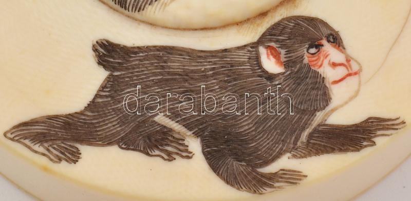 Japán dobozka. Kézzel faragott csont. Majom (makákó) motívumokkal. Korának megfelelő állapotban. Jelzés nélkül, d: 6,5 cm, m: 3,5 cm