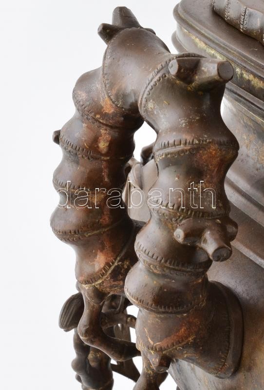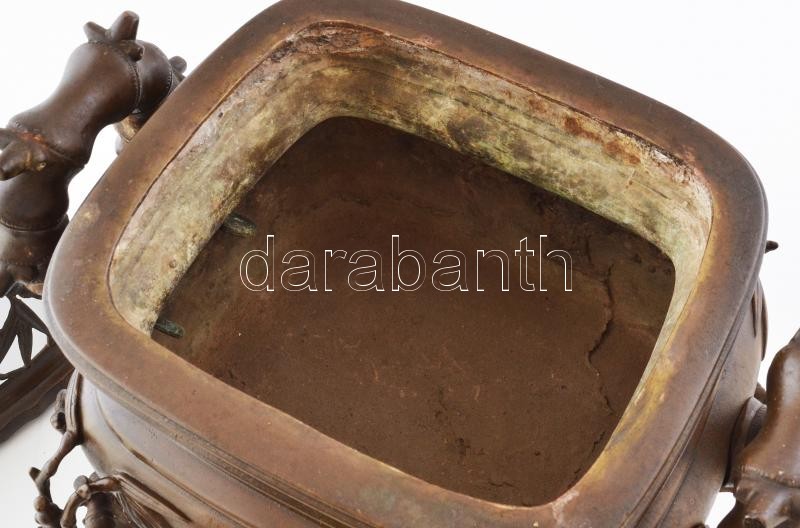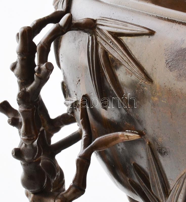 Description: Japán szecessziós, nagyméretű füstölő. Öntött, patinázott bronz. Bambusz és madaras motívumokkal. Korának megfelelő állapotban. Jelzés nélkül. m: 48 cm