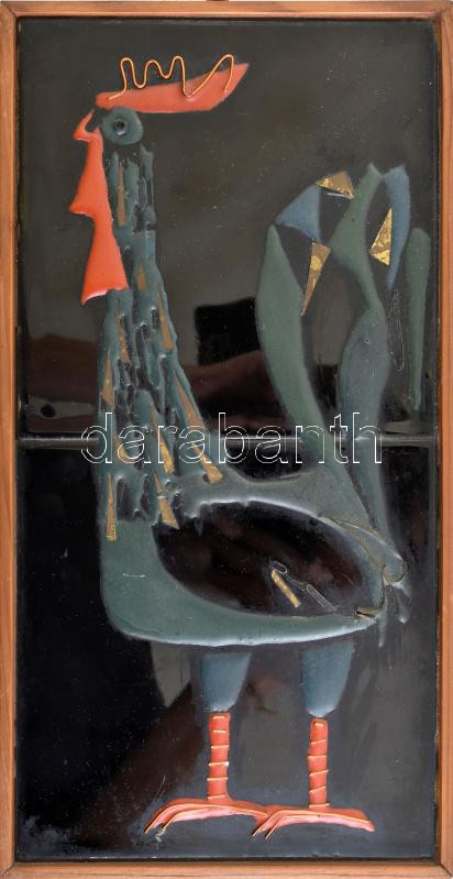 Description: Jelzés nélkül: Kakas. Vegyes technika, applikáció, kerámia csempe. Fa keretben, hátoldalán az Iparművészeti Vállalat hiányos zsűri címkéjével, 30,5x15 cm