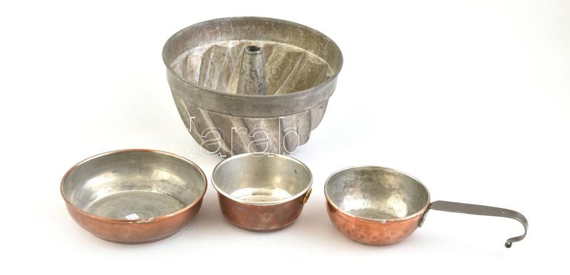 Régi süteményformák, 1 kuglóf, 3 vörösréz. Kopott, d: 10-20 cm
