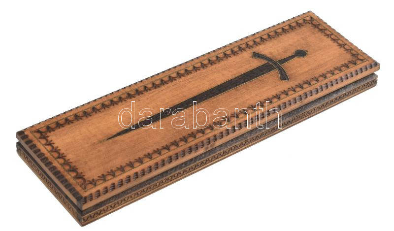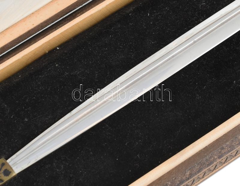 Description: "Szczerbiec" lengyel koronázási kard replika, eredeti fa díszdobozban (a tok fedelének belsején a fólia sérült), 32x9,5 cm / Polish coronation ceremonial sword replica, in original wooden box (foil on the inside is damaged)