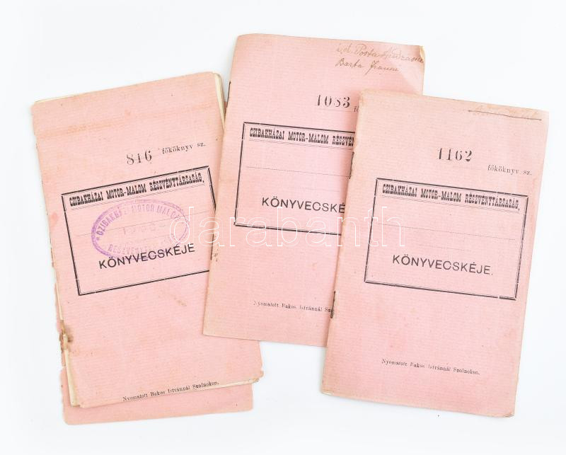 1911 Cibakházai Motor-Malom Rt. 3 db könyvecskéje, egy két bejegyzéssel, pecséttel. Egyik sérült