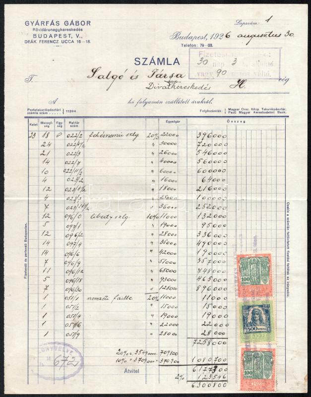 1926 Bp., Gyárfás Gábor rövidáru-nagykereskedés fejléces számlája divatárukról, okmánybélyegekkel