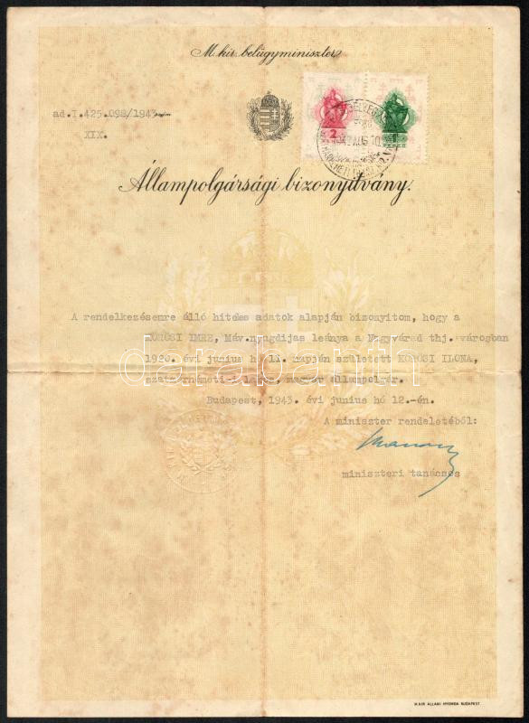 1943 Állampolgársági bizonyítvány erdélyi, nagyváradi lakos részére, h...