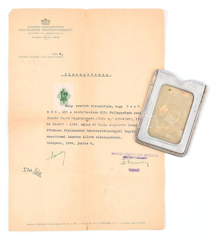 Description: 1944 Bp., a Budapest Székesfővárosi Közlekedési Rt. (BSzKRt.) által kiállított munkáltatói igazolás (bizonyítvány), Gerő Kálmán vasútüzemi lakatos részére + Beszkárt bérlet- / igazolványtartó fém tok, 10,5x7,5 cm