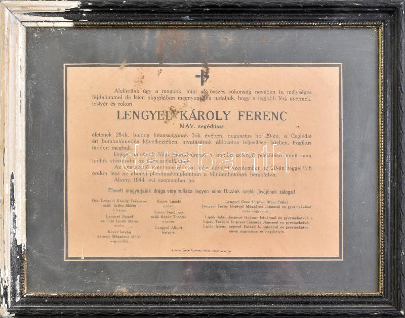 Description: 1944 Lengyel Károly Ferenc, a Ceglédet ért bombatámadás következtében, szolgálatteljesítés közben elhunyt MÁV segédtiszt gyászjelentése. Korabeli, sérült, üvegezett fa keretben, keret: 25,5x33 cm