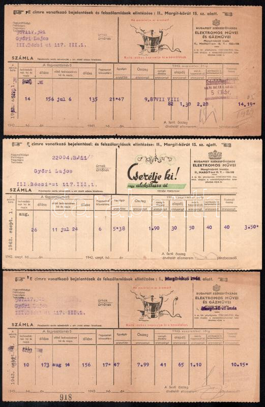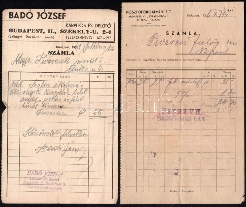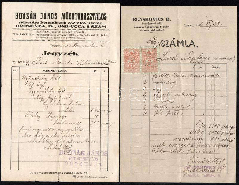 cca 1929-1943 össz. 7 db fejléces számla: Bodzák János műbútoraszatlos (Orosháza), Balaskovics R. bútorkereskedő (Szeged), Elmű (Bp.), stb.
