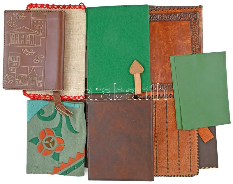 10 db könyvborító, különféle anyagokból (bőr, műbőr, hímzett, stb.)