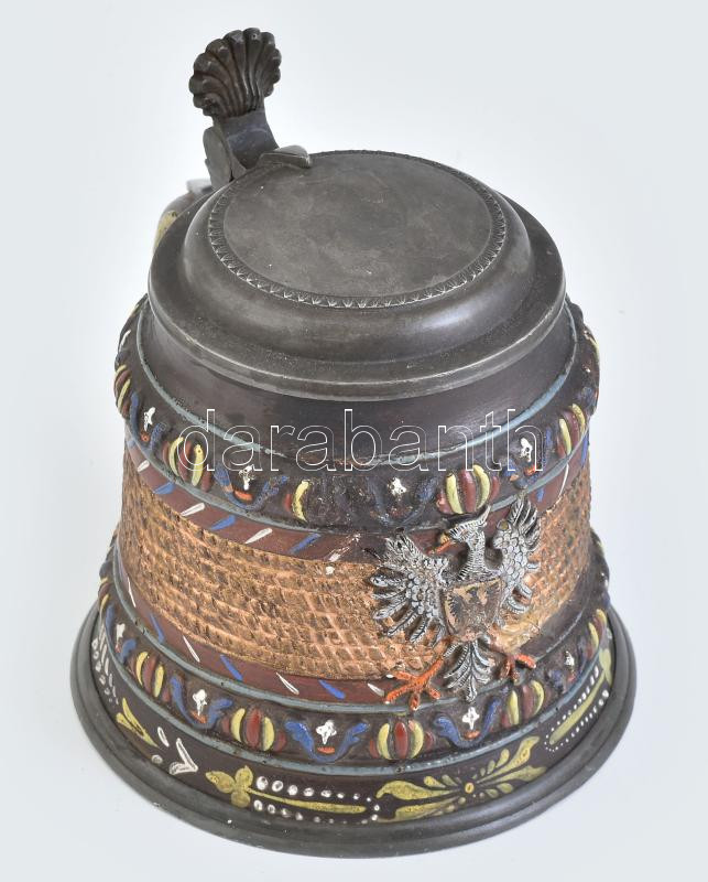 Császári címeres kerámia és fém korsó,. régi, kézzel festett, részben ...