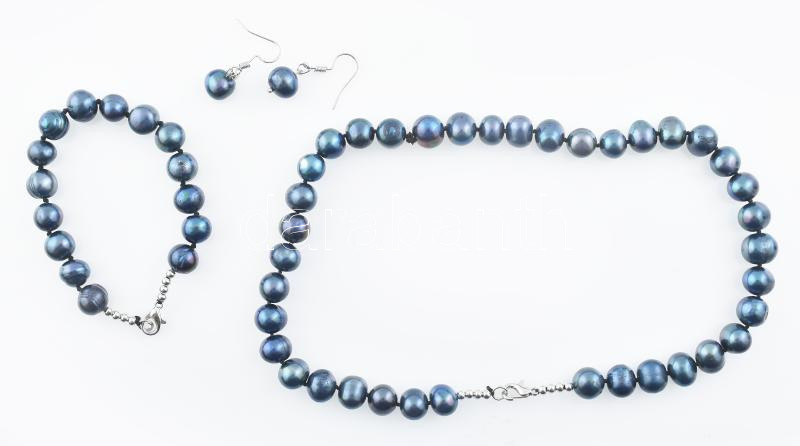 Kék irizáló tenyésztett gyöngy nyaklánc, karkötő és fülbevaló, nyaklánc: h: 40 cm, karkötő: h: 18 cm