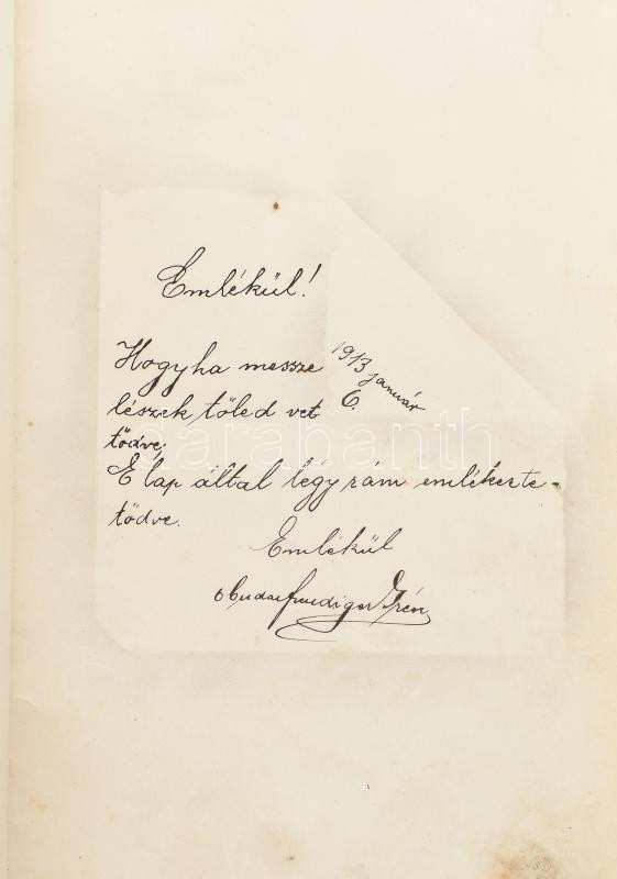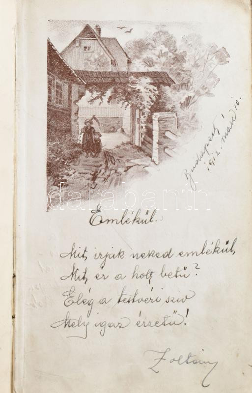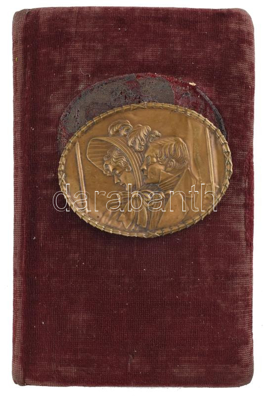 1912-1913 Régi emlékkönyv, magyar és német nyelvű bejegyzésekkel, bársonyborítású, fém plakettel (levált a borítóról) díszített kötésben
