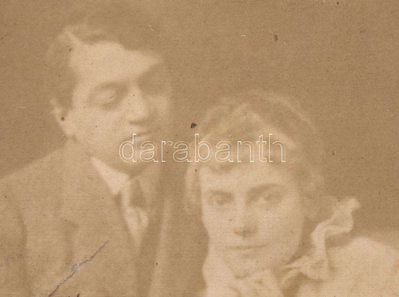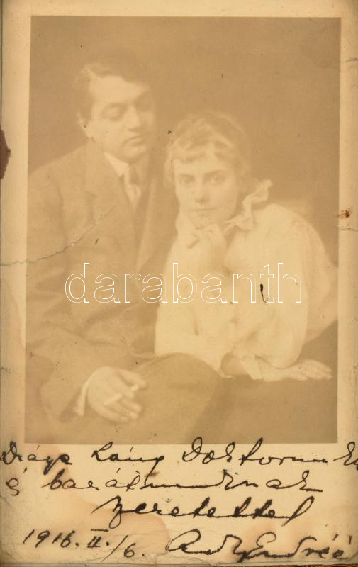 1916 Ady Endre (1877-1919), Csinszkával (Boncza Berta 1894-1934) közös fényképe, kezelőorvosának dr. Láng Menyhért ideggyógyásznak dedikálva Csinszka által . "Drága . Láng doktorunknak és barátunknak szeretettel 1916. II. 6. Ady Endréék" Ady a feltehetően már 1902-ben elkapott szifilisz miatt, szinte folyamatosan kezelés alatt állott. Ahogy súlyosbodott betegsége úgy volt egyre inkább szüksége orvosaira, akikkel bizalmas, jó kapcsolatot tartott fenn.. Az üzenet címzettje dr. Láng Menyhért ideggyógyász 1915-16 ban volt Ady kezelőorvosa és elsődleges betegségén - a vérbajon - felül az alkoholizmust diagnosztizálta, mint Ady romlásának legfőbb okát. Fotó üvegezett keretben. Fotó mérete 8,5x13,5 cm. A képen egy helyütt beszakadással