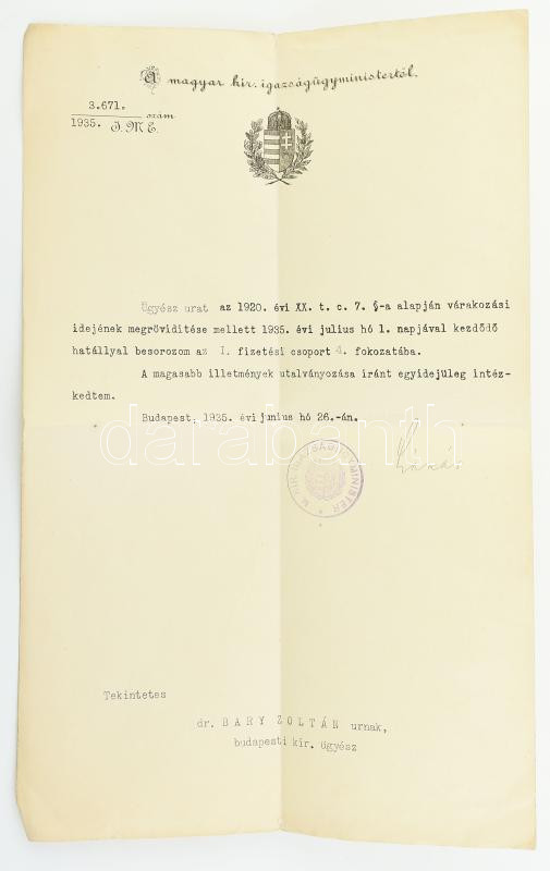 1935 Bp., Lázár Andor (1882-1971), a Gömbös- és a Darányi-kormány igazságügy-miniszterének autográf aláírása és bélyegzője Dr. Bary Zoltán ügyész részére szóló kinevezésen