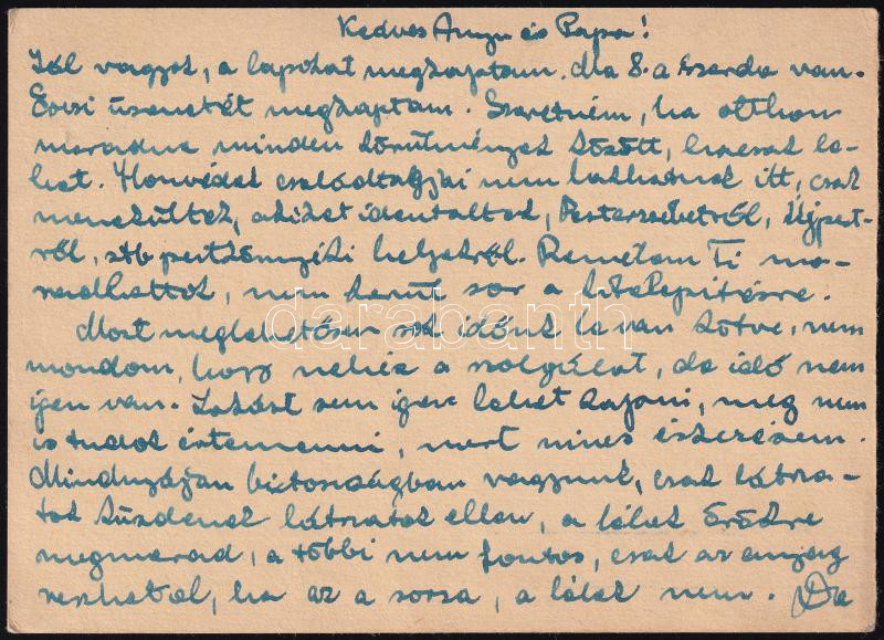1944 novembere, ifj. Czene Béla (1911-1999) festőművész autográf sorai szüleinek karpaszományos honvédként, id. Czene Béla (1886-1944 körül) festőművészhez és feleségének Válról. Említi, hogy felesége, Hikádi Erzsébet (1911-2008) ne jöjjön hozzá, mert menekülteket telepítenek oda Újpestről, Pesterzsébetről és más pestkörnyéki helyekről. Más érdekes részlettel. Másfél beírt oldal levelezőlapon, ifj. Czene Béla autográf aláírásával. Proveniencia: a művész hagyatéka.