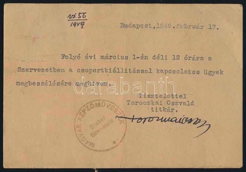 1949 Toroczkai Oszvald (1884-1951), a Szabad Képzőművészek Szakszervezete titkárának levele ifj. Cezene Béláné Hikádi Erzsébet festőművészhez (1911-2008), amelyben a csoportkiállítással kapcsolatos ügyek megbeszélésére hívja. Toroczkai Oszvald (1884-1951) autográf aláírásával, Szabad Képzőművészek Szakszervezete bélyegzőjével. Proveniencia: a művész hagyatéka. Hajtásnyommal, kissé foltos.