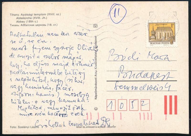 1982.I.16 Keresztury Dezső (1904-1996) író, költő, korábbi politikus autográf verses sorai Bódi Marának, a Tihanyi apátságot ábrázoló képeslapon, Balatonfüredi bélyegzővel: "Halhatalan nem lesz azért se ő, se én (...)". Keresztury Dezső autográf aláírásával.