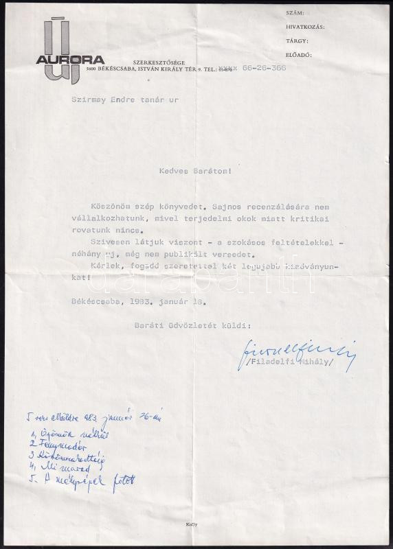 1983 Filadelfi Mihály (1930 - ) költő, író, az Új Auróra szerkesztőjének gépelt levele, fejléces papíron, saját kezű aláírásával Szirmay Endre (1920 - 2013) költő, irodalomtörténész és műfordító részére.