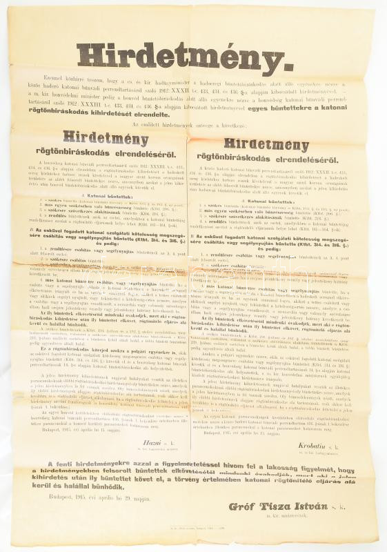 https://www.darabanth.com/en/435-Online-auction/435.0/Art-and-other-collectibles/Military~500029/1915-Statarium-kihirdetese-katonai-buntettek-targyaban-Nagy-meretu-plakat-hajtva-kis-besza~II2821638