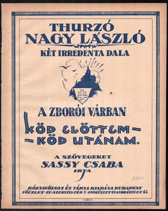 cca 1923 Thurzó Nagy László: A zborói várban. Köd előttem - köd utánam... https://www.darabanth.com/en/435-Online-auction/435.0/Art-and-other-collectibles/Music-Musical-notes-Instruments~2000002/cca-1923-Thurzo-Nagy-Laszlo-A-zboroi-varban-Kod-elottem-kod-utanam--ket-irredenta-~II2816994