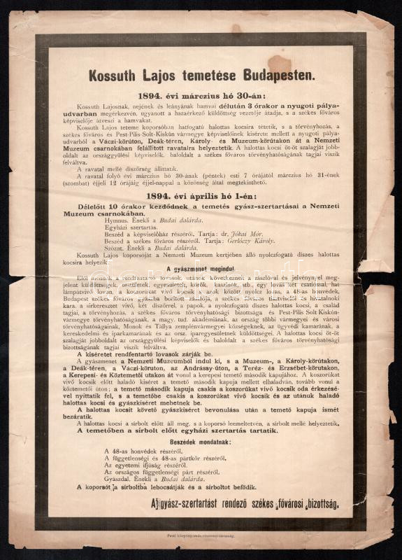 Description: 1894 Kossuth Lajos temetése Budapesten, 1894. márc. 30.-ápr. 1. Hirdetmény a gyászszertartás menetével. Bp., Pesti Könyvnyomda Rt. Szakadásokkal, néhány kis folttal, középen hajtott, 35x25 cm