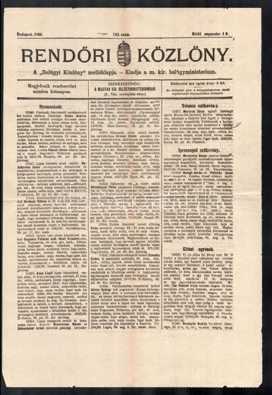 1896 Rendőri Közlöny 183. száma. 2 p
