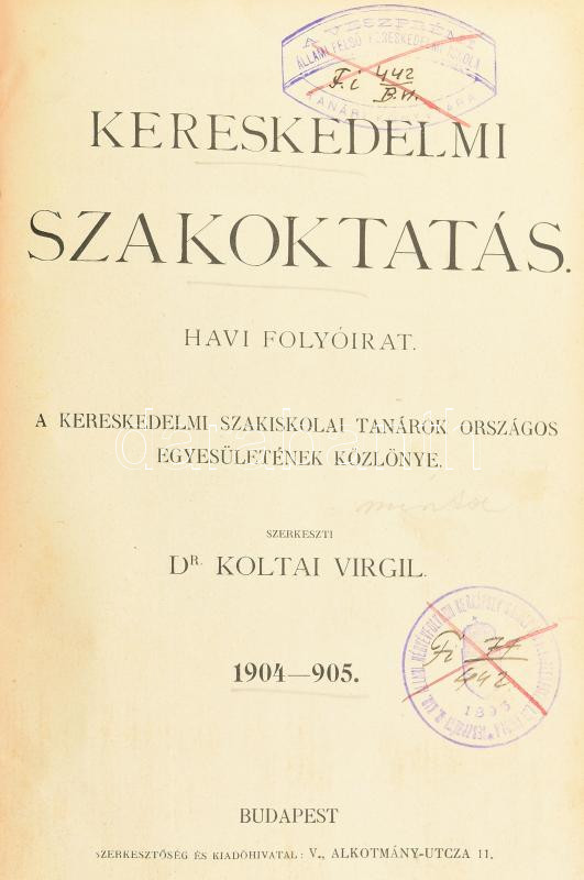 1904-1905 Kereskedelmi Szakoktatás c. havilap. XIII. évf. 1-10. sz. (Teljes évfolyam, július-augusztusban nem jelent meg.)1904. szept. - 1905. jun. Szerk.: dr. Koltai Virgil. Kopott, foltos félvászon-kötésben, kopott borÃtóval, intézményi bélyegzÅ‘vel, egy lap hiányzik (235/236). A 7. szám valószÃnűleg kettÅ‘s szám (7-8. sz.) Erre utal, hogy az oldalszámozás folyamatos (egy lap hiányzik, de az is a 7. szám elÅ‘tt), és a tartalomjegyzék is VI-VII. számként hivatkozik rá.